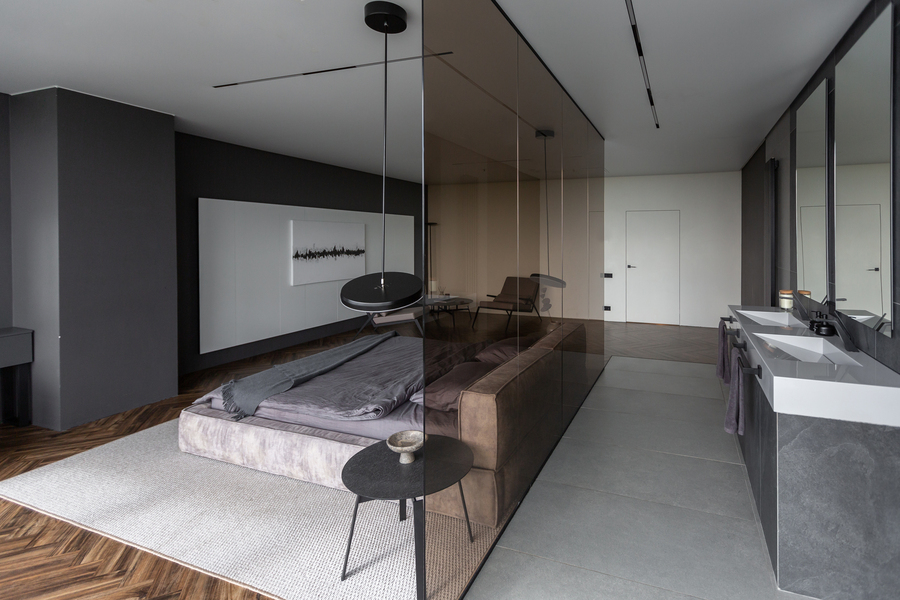 Гардеробные, обустроенные за стеклом, превращаются в стильный элемент. Рабочий кабинет, отделенный прозрачной стеной, становится продолжением жилого пространства, но при этом остается функциональной зоной для работы или творчества.