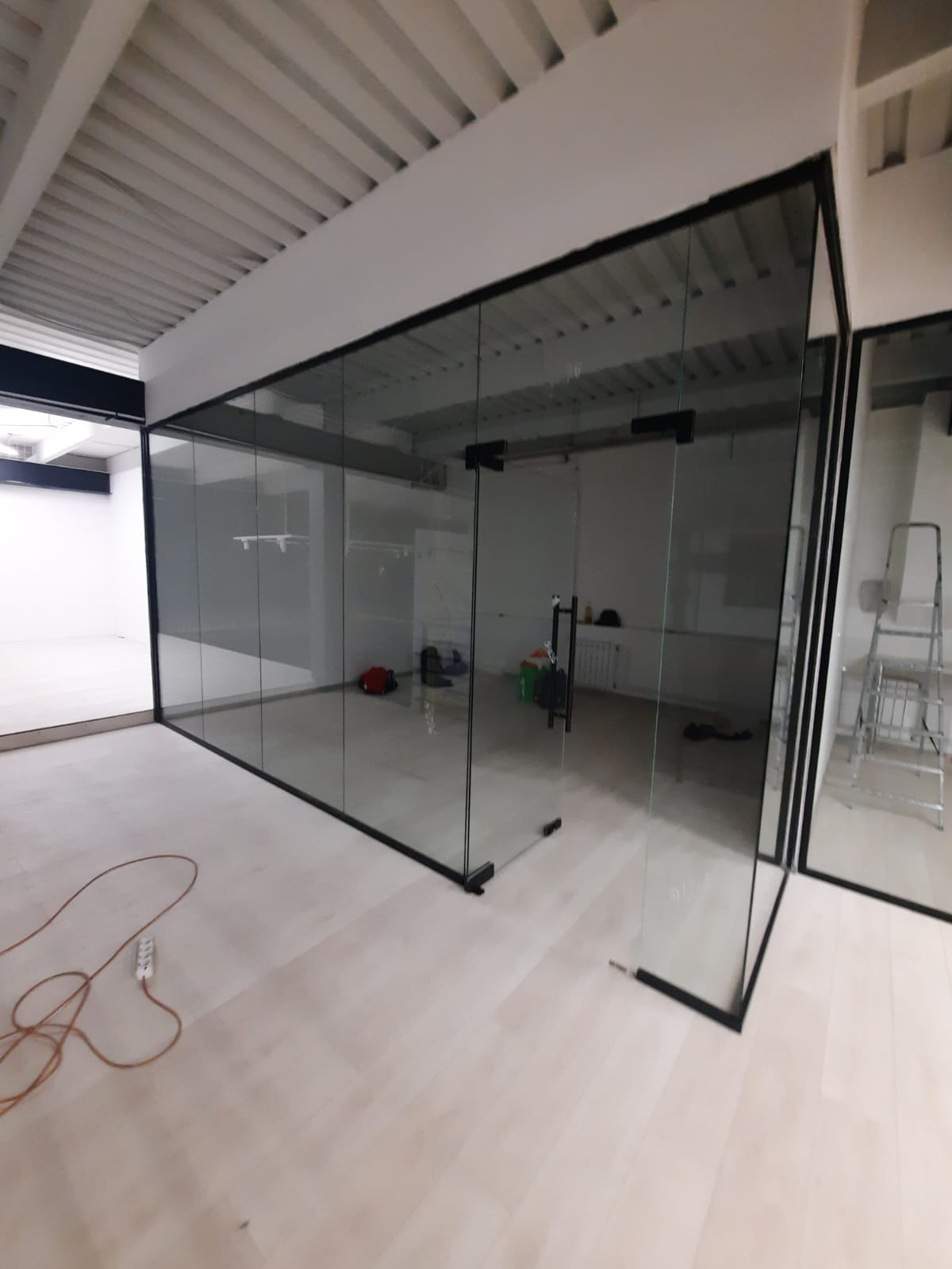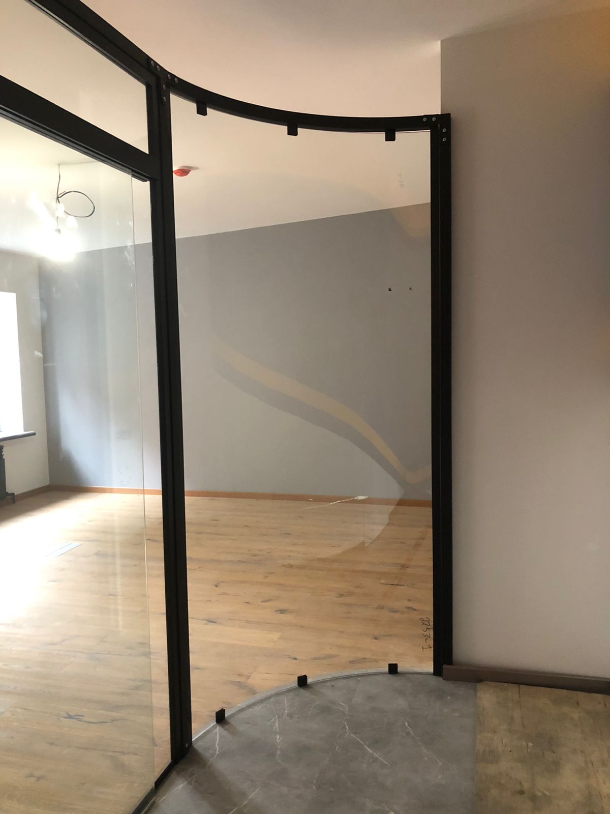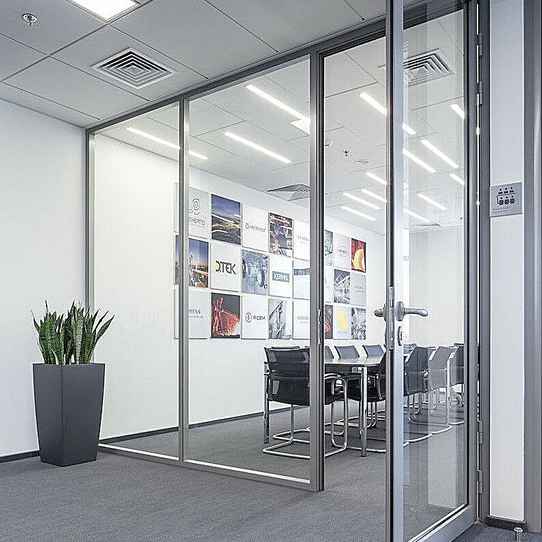 Стеклянные перегородки обычно изготавливаются из прочного стекла и могут делить помещение на несколько отдельных секций, организуя их с помощью дверей и доступных через нее проходов. Это обеспечивает как приватность работы как внутри помещения, так и смену пространства в течении дня без перестановки перегородок.